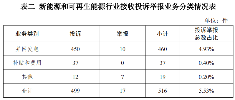 新能源和可再生能源行业排在第二位,数量为516件、占投诉举报总数的5.53%,主要集中在并网发电、补贴和费用等方面。