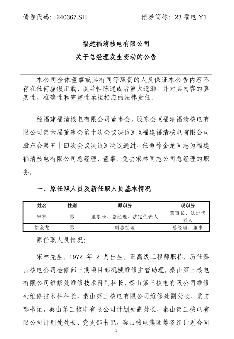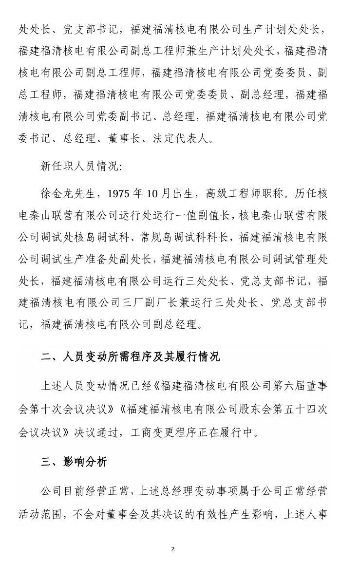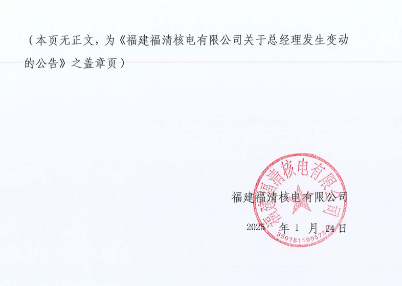 1月24日,福建福清核电有限公司发布公告称,经公司董事会、股东会《福建福清核电有限公司第六届董事会第十次会议决议》《福建福清核电有限公司股东会第五十四次会议决议》决议通过,任命徐金龙同志为福建福清核电有限公司总经理、董事,免去宋林同志公司总经理的职务。