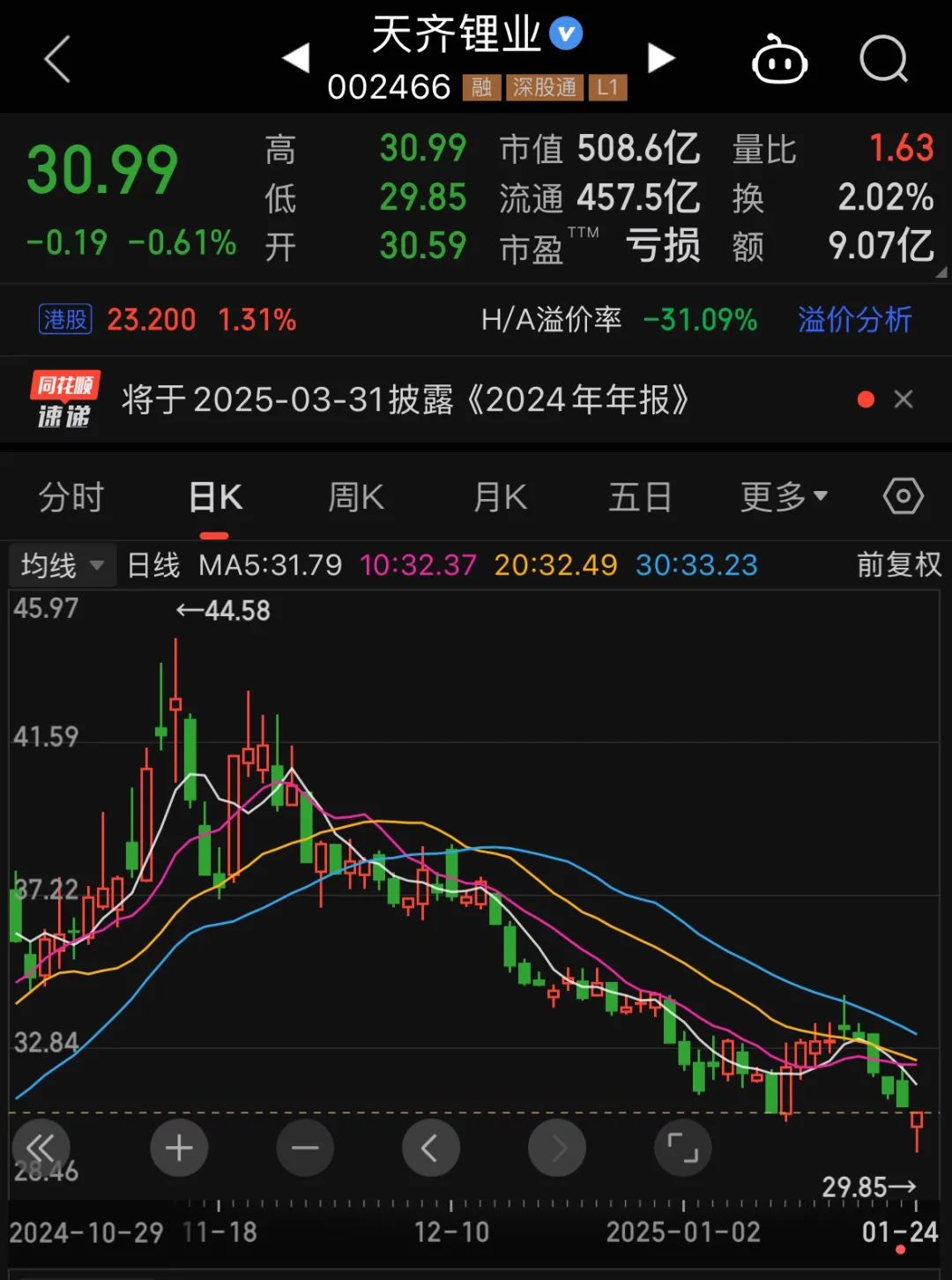 1月24日,天齐锂业A股收跌0.61%,H股收涨1.31%。