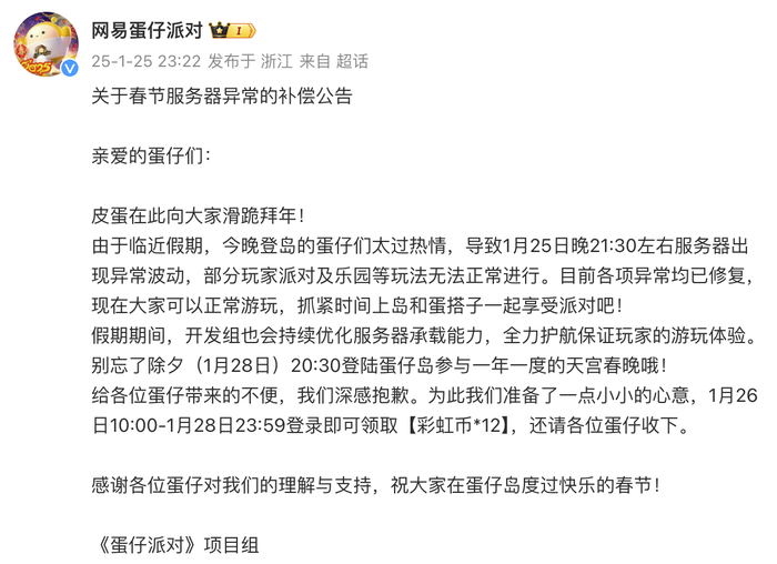 1月25日23时22分,网易《蛋仔派对》项目组发布公告称,1月25日晚21:30左右服务器出现异常波动,部分玩家派对及乐园等玩法无法正常进行。目前各项异常均已修复。