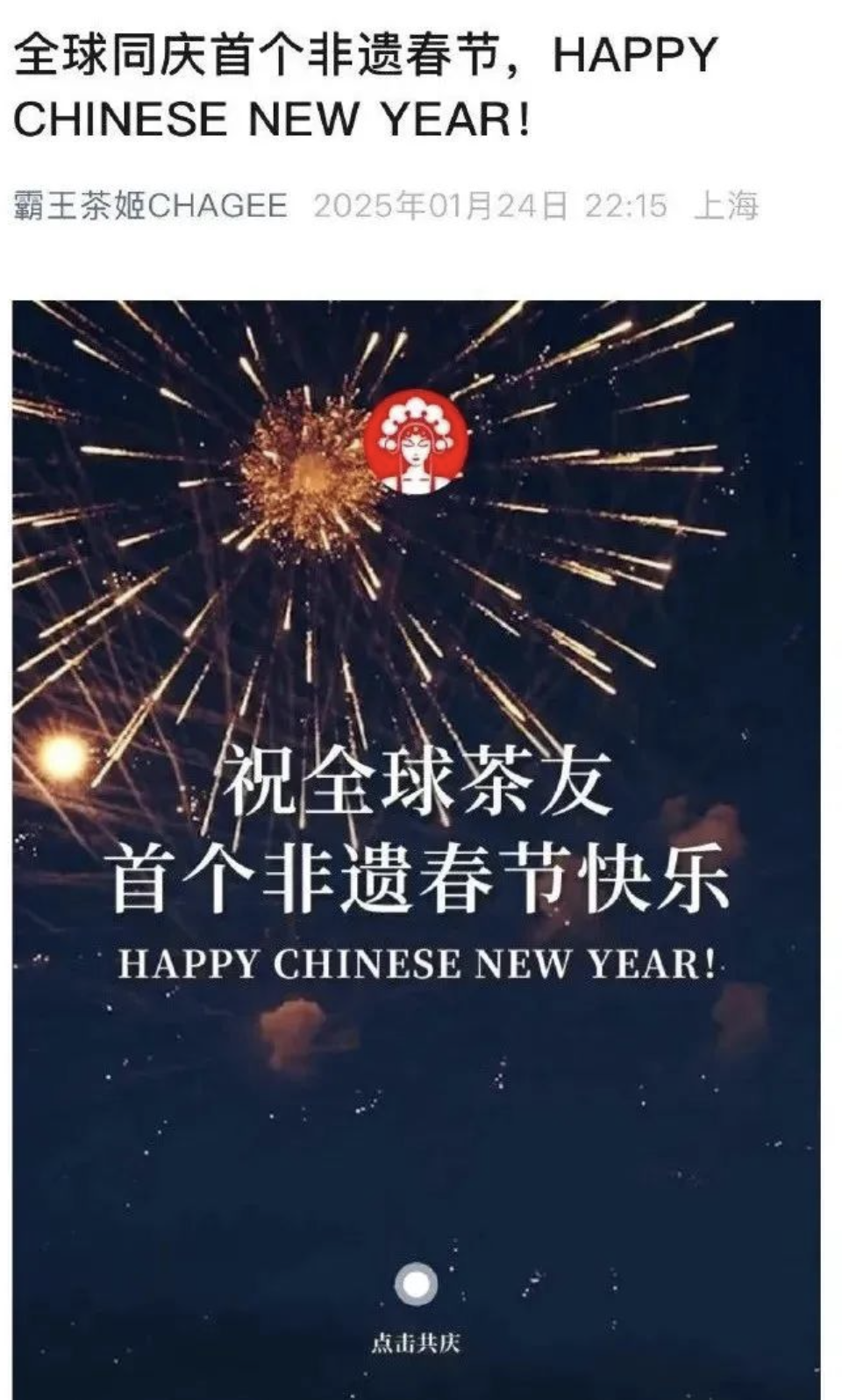 此前,有网友发现霸王茶姬在境外社交平台上发布的文案使用了Lunar New Year来指代春节,而不是Chinese New Year或Spring Festival。