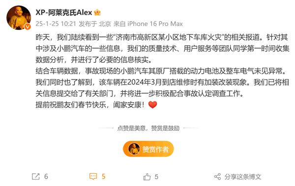 1月25日,小鹏汽车公关负责人回应“小鹏汽车起火烧毁地库十几辆车”一事。