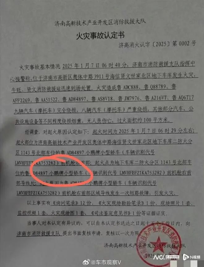 据南方都市报报道,1月7日,山东济南市某小区地下车库内发生火灾。据一博主披露的上述火灾事故认定书,当地消防救援大队调查后认定起火点为一“小鹏牌小型轿车”,起火原因为该轿车“前机舱右前部区域导线发生一次短路故障,引发火灾”。该事故造成9辆汽车(摩托车)完全烧损、8辆汽车(摩托车)严重烧损,其他部分汽车、公共设施设备等不同程度烧损烟熏,无人员伤亡,过火面积约100平方米。