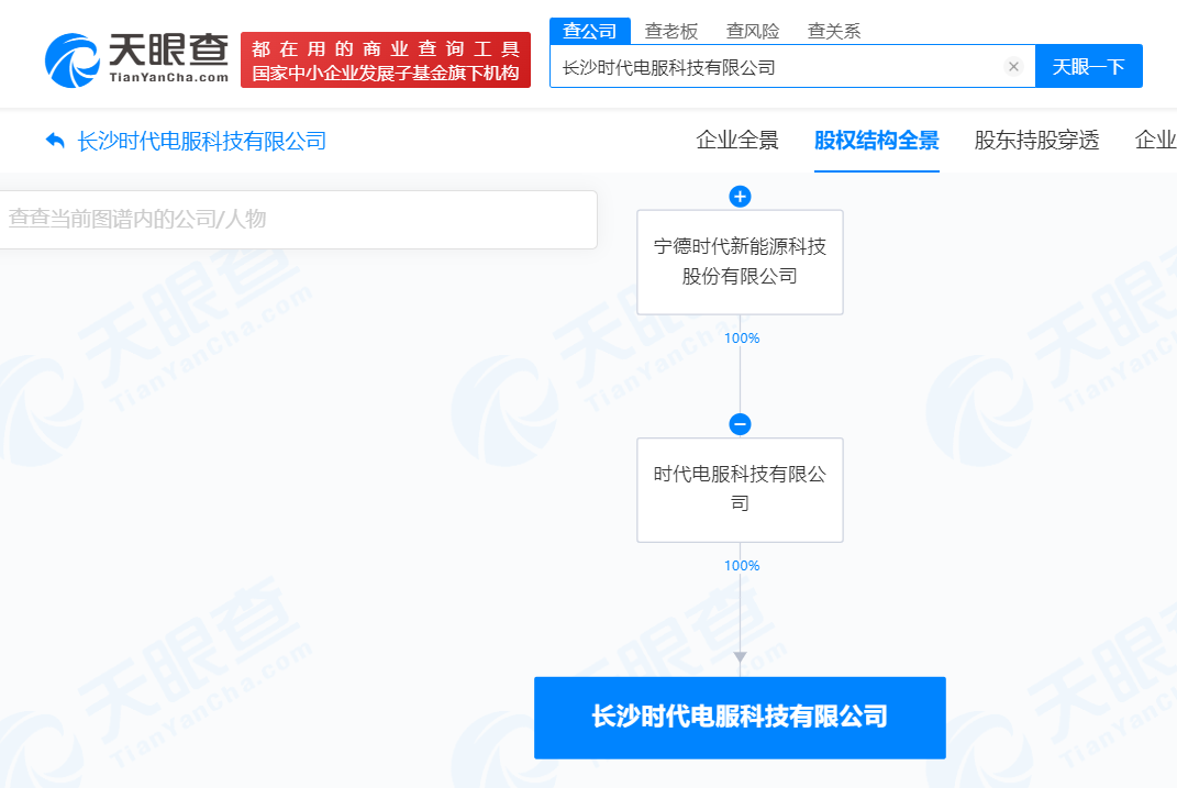 天眼查App显示,近日,长沙时代电服科技有限公司成立,法定代表人为王国刚,注册资本2000万人民币,经营范围含电气安装服务、电动汽车充电基础设施运营、智能输配电及控制设备销售、新能源汽车电附件销售、智能控制系统集成、软件开发、信息技术咨询服务、信息咨询服务、新能源汽车整车销售等。股权全景穿透图显示,该公司由时代电服科技有限公司全资持股,后者为宁德时代(300750)全资子公司。