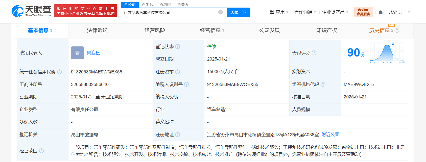 天眼查App显示,近日,江苏慧鼎汽车科技有限公司成立,法定代表人为夏迎松,注册资本1.5亿人民币,经营范围含汽车零部件研发、汽车零部件及配件制造、汽车零配件批发、汽车零配件零售、储能技术服务、工程和技术研究和试验发展、货物进出口等。股东信息显示,该公司由中鼎股份(000887)全资持股。