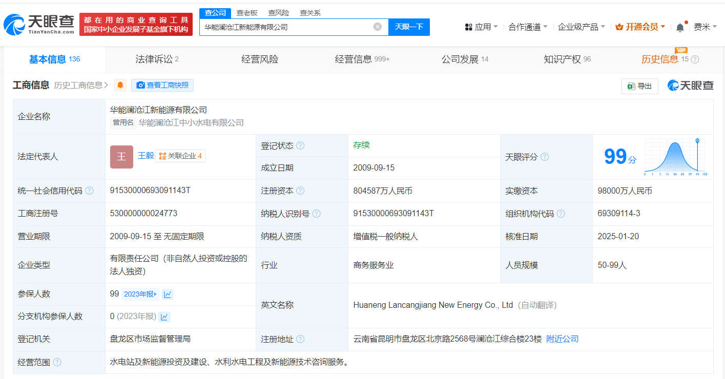天眼查App显示,近日,华能澜沧江新能源有限公司发生工商变更,注册资本由9.8亿人民币增至约80.5亿人民币,增幅约721%。
