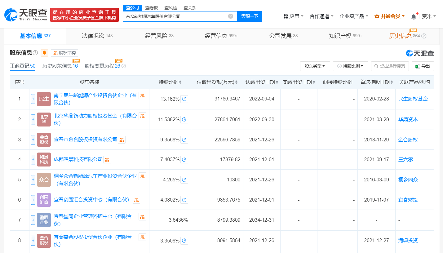 合众新能源汽车股份有限公司成立于2014年10月,法定代表人为方运舟,注册资本约28.37亿人民币,由南宁民生新能源产业投资合伙企业(有限合伙)、北京华鼎新动力股权投资基金(有限合伙)、方运舟等共同持股。天眼风险信息显示,该公司现存多条被执行人及股权冻结信息。