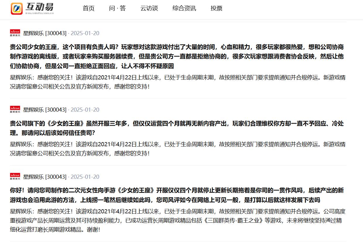 《少女的王座》官方公众号显示,其运营企业为广东星辉天拓互动娱乐有限公司,该款游戏于2019年3月开始内测,2021年4月22日首发。记者注意到,2019年至2023年初,该公众号偶尔还会发布文章,但2023年2月后,公众号就有超过一年半的时间停止更新,随后在2024年11月6日发布停运公告。