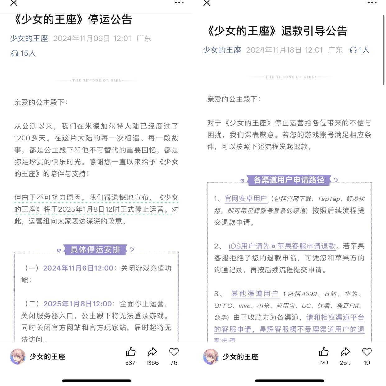 2024年11月18日,《少女的王座》再次发布公告称,将对2024年5月6日-2024年11月6日有过充值行为的消费者进行退款,并称若玩家账号截至2024年11月6日前仍有尚未使用的付费获得的货币,亦可以进行退款。根据公告,公司将在今年1月19日至3月27日统一进行退款。