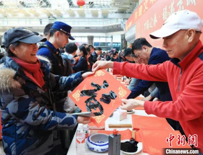 1月22日,北京西站候车大厅内,中国铁路北京局文联、北京市文联联合举办“万福迎春·福满京城艺润万家”春节文化惠民·书法公益活动,首都15名书法家现场挥毫泼墨,书写春联福字1000余幅赠送给候车旅客,为他们送上新春祝福。