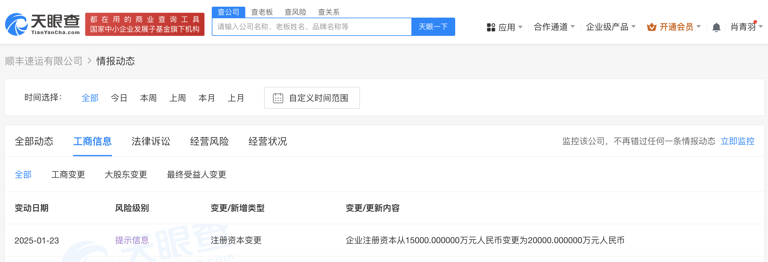天眼查App显示,近日,顺丰速运有限公司发生工商变更,注册资本由1.5亿人民币增至2亿人民币。