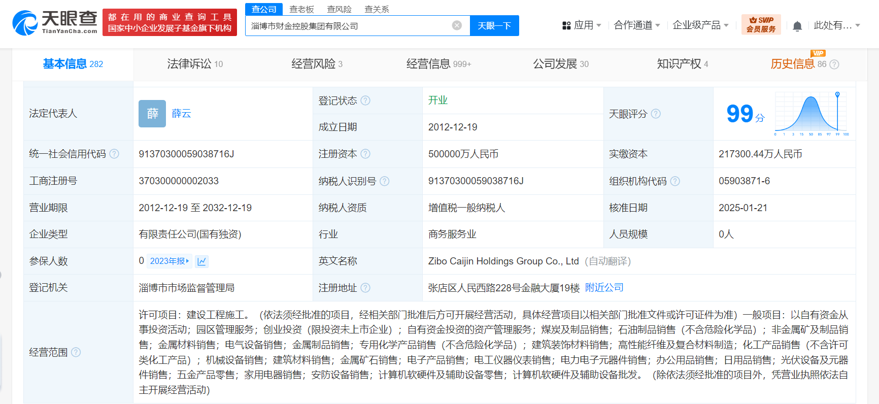 该公司成立于2012年12月,法定代表人为薛云,经营范围含建设工程施工、以自有资金从事投资活动、园区管理服务、创业投资、自有资金投资的资产管理服务、煤炭及制品销售、石油制品销售、计算机软硬件及辅助设备零售、计算机软硬件及辅助设备批发等。股东信息显示,该公司由淄博市财政局全资持股。
