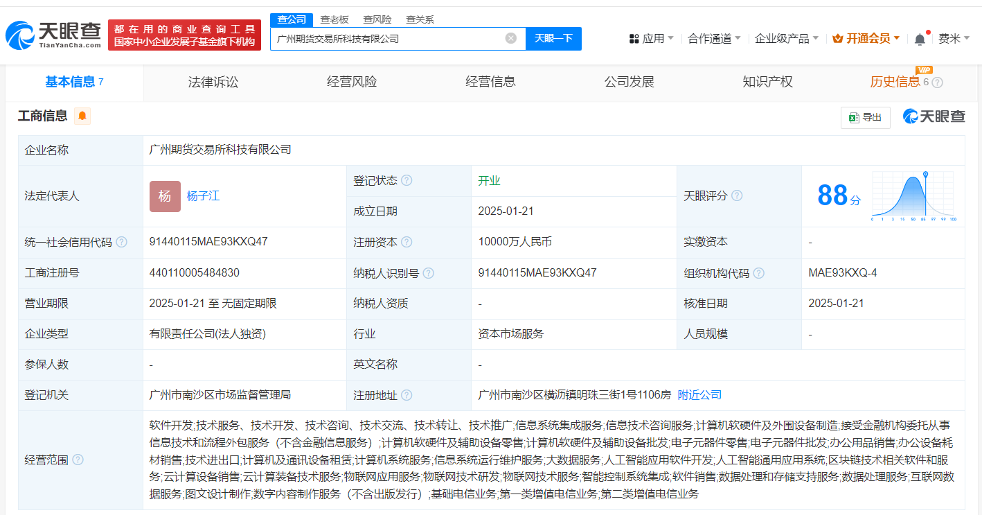天眼查App显示,近日,广州期货交易所科技有限公司成立,法定代表人为杨子江,注册资本1亿人民币,经营范围含信息系统集成服务、信息技术咨询服务、计算机软硬件及外围设备制造、大数据服务、人工智能应用软件开发、人工智能通用应用系统等,由广州期货交易所股份有限公司全资持股。