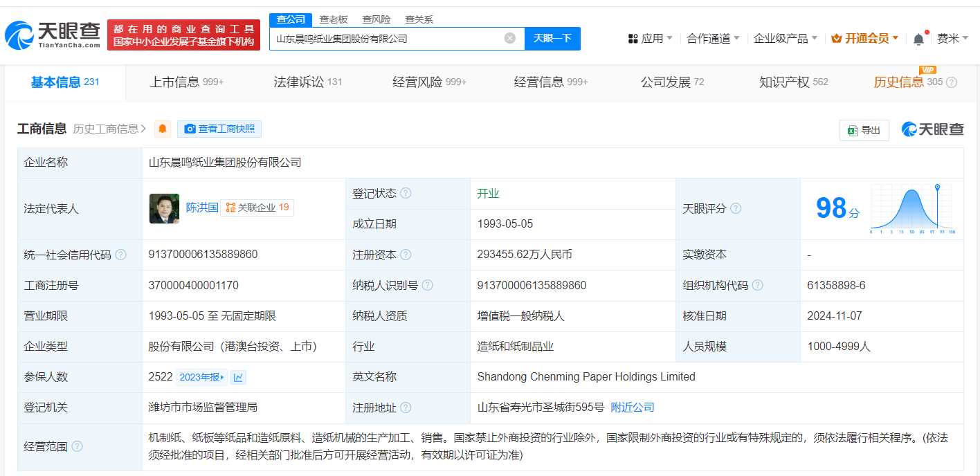 山东晨鸣纸业集团股份有限公司成立于1993年5月,法定代表人为陈洪国,注册资本约29.3亿人民币,由晨鸣控股有限公司、香港中央结算(代理人)有限公司、晨鸣控股(香港)有限公司等共同持股。天眼风险信息显示,该公司所持多家公司股权已被冻结。