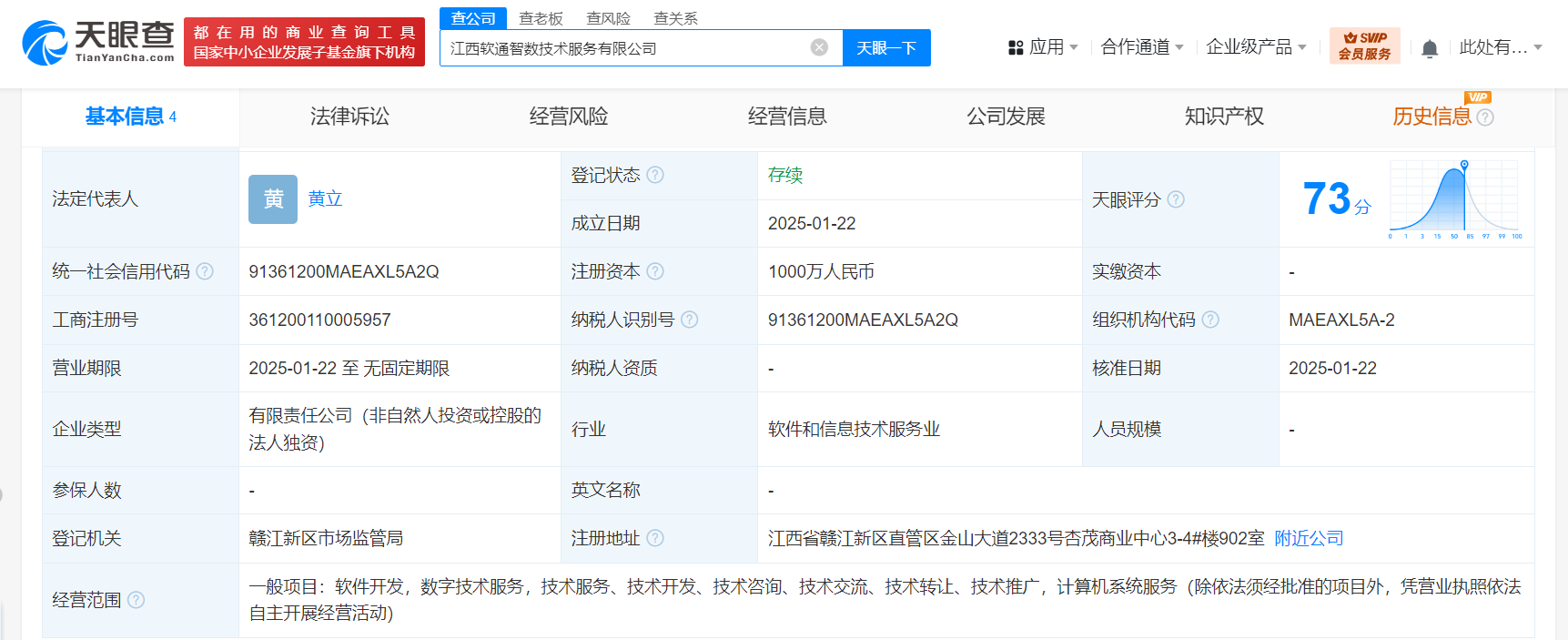 天眼查App显示,近日,江西软通智数技术服务有限公司成立,法定代表人为黄立,注册资本1000万人民币,经营范围为软件开发,数字技术服务,技术服务、技术开发、技术咨询、技术交流、技术转让、技术推广,计算机系统服务。股东信息显示,该公司由软通动力(301236)全资持股。