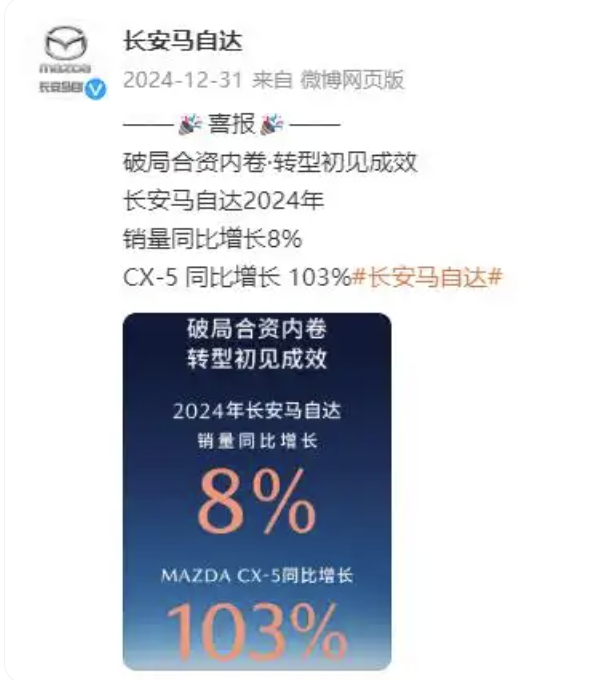 2024年12月31日,长安马自达在官方网站和社交媒体上高调宣布,自称2024年全年销量实现了同比增长8%的佳绩,其中MAZDA CX-5车型同比增长103%。
