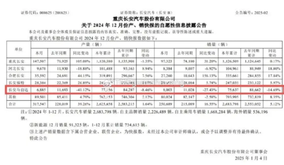 然而,作为长安马自达的中方最大股东,长安汽车却在2025年1月初发布的披露公告中,公布了截然不同的数据。报告显示,长安马自达全年累计销量仅为75637辆,同比下滑14.69%。
