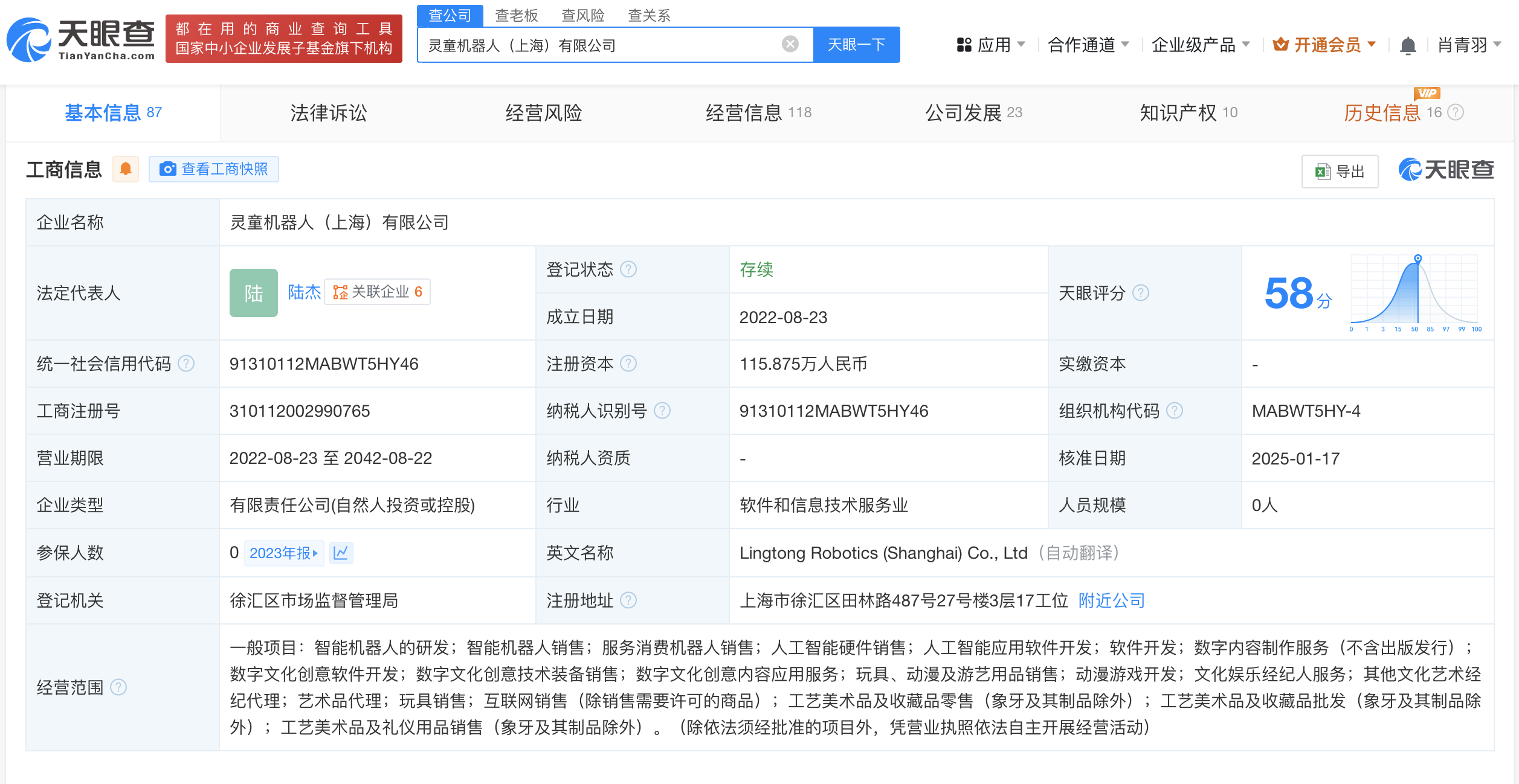 灵童机器人(上海)有限公司成立于2022年8月,法定代表人为陆杰,经营范围含智能机器人的研发、智能机器人销售、服务消费机器人销售、人工智能硬件销售、人工智能应用软件开发、数字内容制作服务等。