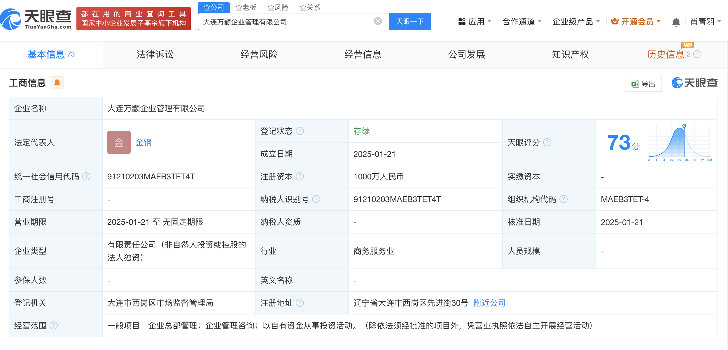 天眼查App显示,近日,大连万颛企业管理有限公司成立,法定代表人为金钢,注册资本1000万人民币,经营范围包括企业总部管理、企业管理咨询、以自有资金从事投资活动,由大连万达商业管理集团股份有限公司全资持股。