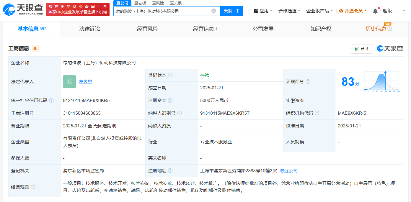 天眼查App显示,近日,绿的谐波(上海)传动科技有限公司成立,法定代表人为左昱昱,注册资本5000万人民币,经营范围包括齿轮及齿轮减、变速箱销售,轴承、齿轮和传动部件销售等。股东信息显示,该公司由苏州绿的谐波传动科技股份有限公司全资持股。
