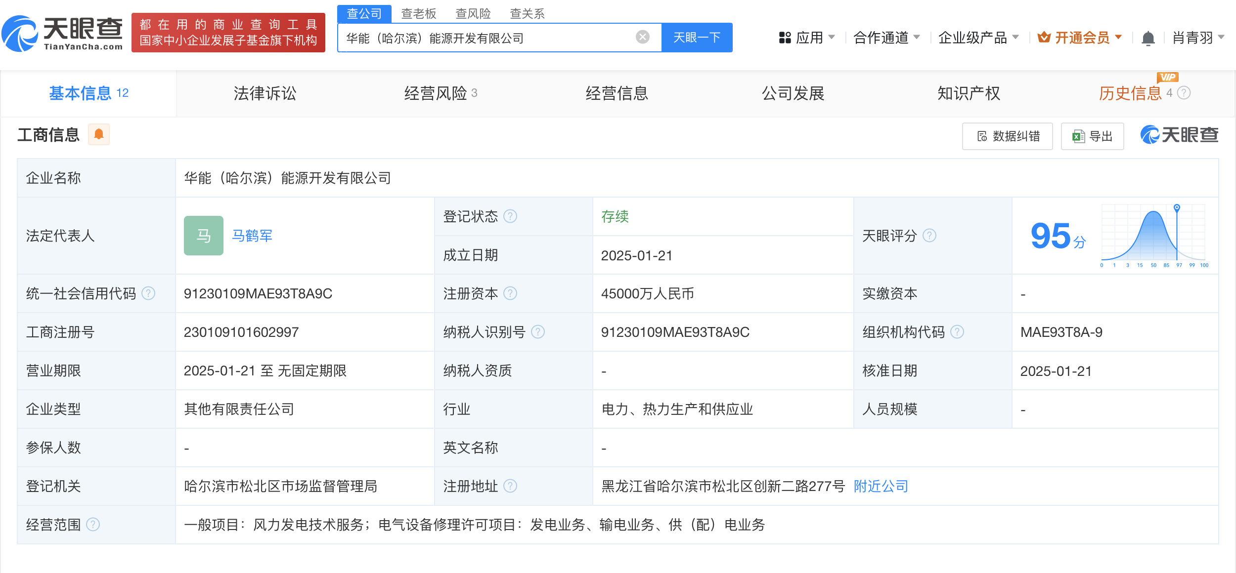 天眼查App显示,近日,华能(哈尔滨)能源开发有限公司成立,法定代表人为马鹤军,注册资本4.5亿人民币,经营范围包括风力发电技术服务、电气设备修理等。股东信息显示,该公司由华能国际(600011)旗下华能黑龙江发电有限公司、中国一重(601106)共同持股。