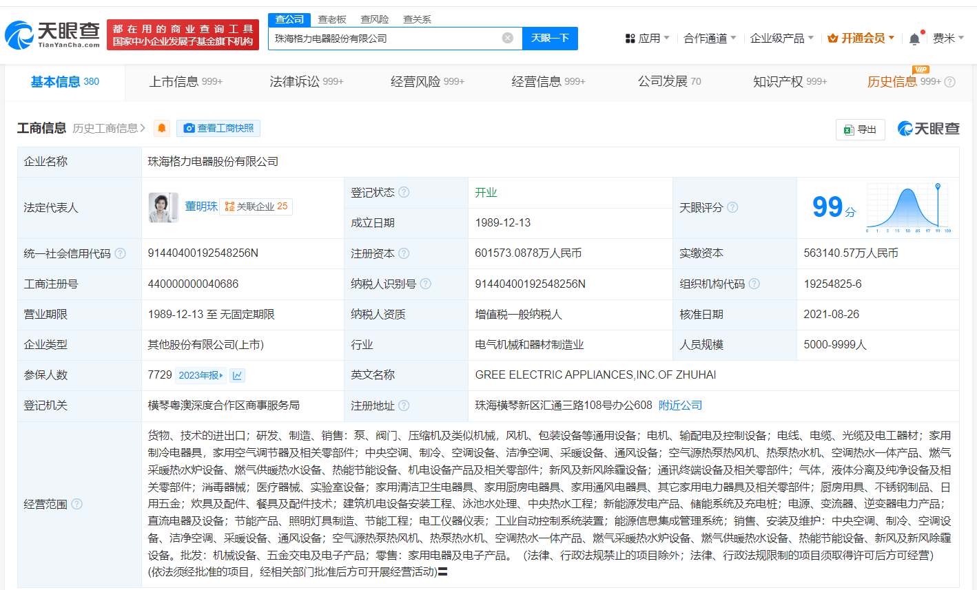 珠海格力电器股份有限公司成立于1989年12月,法定代表人为董明珠,注册资本约60.2亿人民币,经营范围含货物、技术的进出口,批发机械设备、五金交电及电子产品,零售家用电器及电子产品等,由珠海明骏投资合伙企业(有限合伙)、香港中央结算有限公司、京海互联网科技发展有限公司等共同持股。