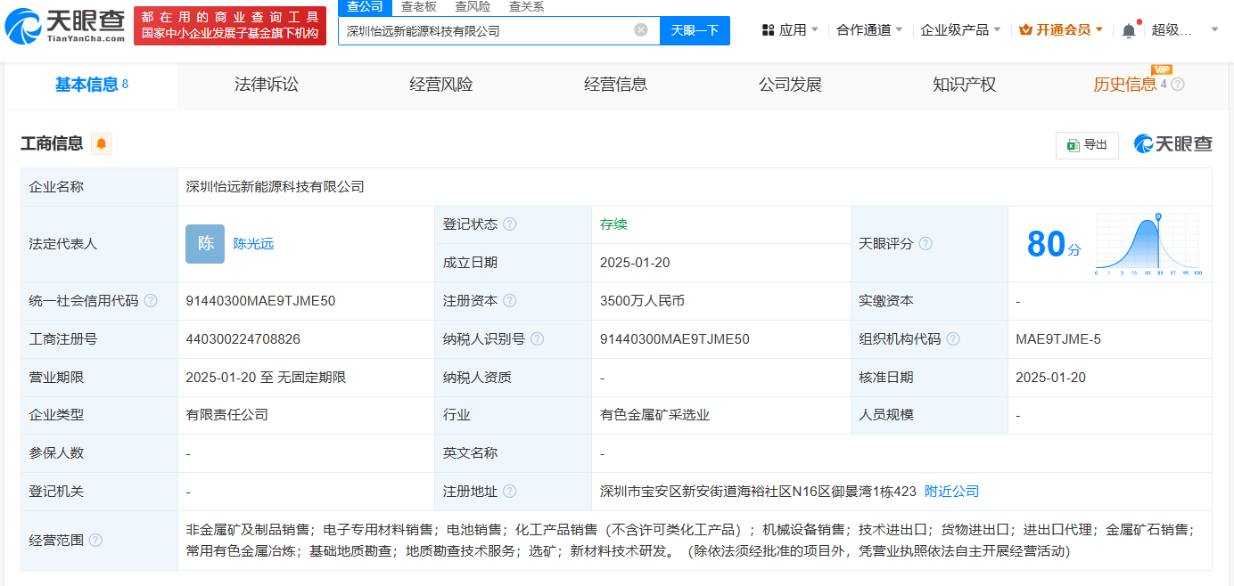 天眼查App显示,近日,深圳怡远新能源科技有限公司成立,法定代表人为陈光远,注册资本3500万人民币,经营范围包括非金属矿及制品销售、电子专用材料销售、电池销售、化工产品销售等。股东信息显示,该公司由怡亚通(002183)旗下深圳市前海怡亚通供应链有限公司、陈光远共同持股。