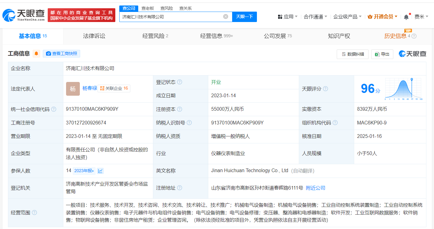 济南汇川技术有限公司成立于2023年1月,法定代表人为杨春禄,经营范围含机械电气设备制造、机械电气设备销售、工业自动控制系统装置制造、工业自动控制系统装置销售、仪器仪表销售、电子元器件与机电组件设备销售等,由汇川技术(300124)全资持股。