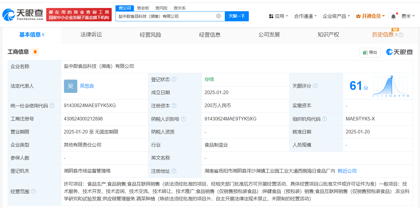 天眼查App显示,近日,盐中甜食品科技(湖南)有限公司成立,法定代表人为吴忠良,注册资本200万人民币,经营范围含食品生产、食品销售、食品互联网销售、农业科学研究和试验发展等,由湖南海日食品有限公司、马云投资的一米八品牌旗下一米八发酵科技(杭州)有限公司共同持股。值得一提的是,去年1月,一米八发酵科技(杭州)有限公司成立了盐中甜食品科技(昆明)有限公司。