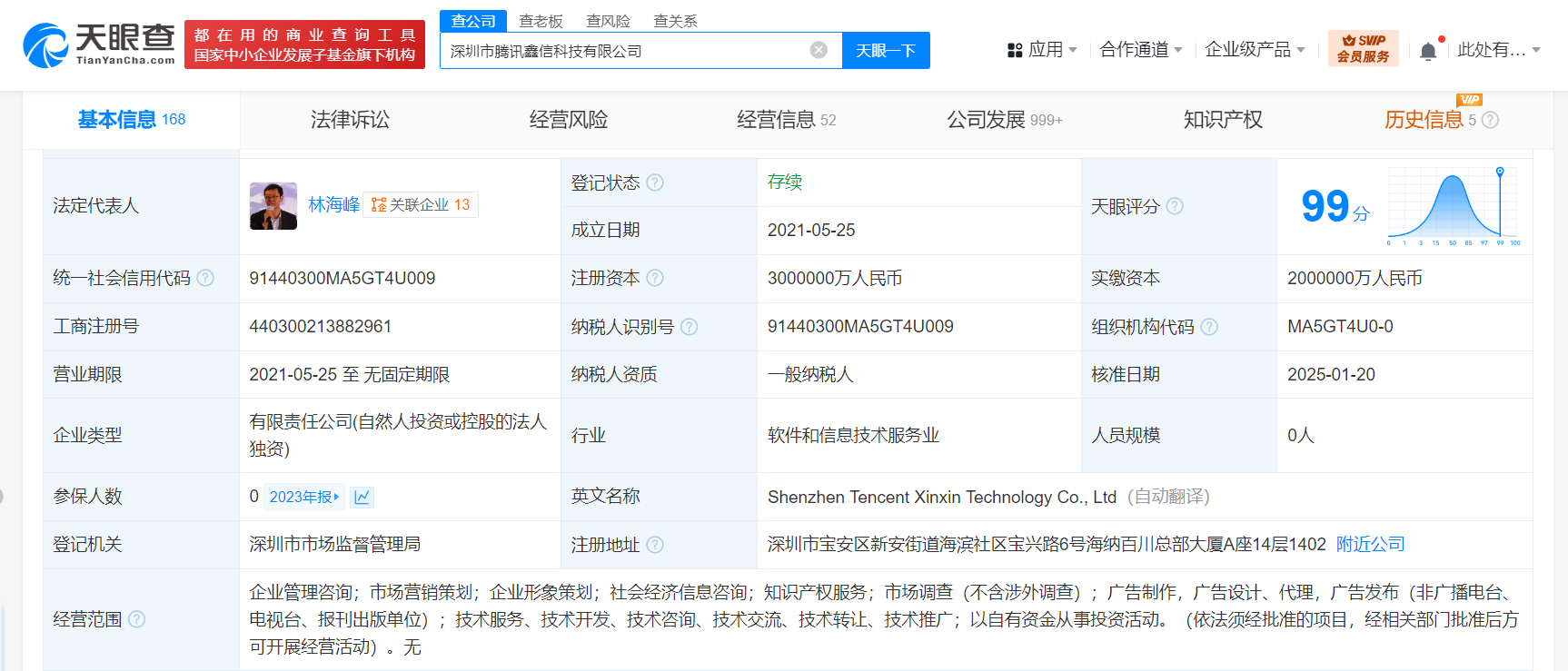 该公司成立于2021年5月,法定代表人为林海峰,经营范围含企业管理咨询、市场营销策划、企业形象策划、社会经济信息咨询、知识产权服务、以自有资金从事投资活动等。股权全景穿透图显示,该公司由深圳市腾讯斐泰科技有限公司全资持股,后者由马化腾、许晨晔、卢山分别持股60%、35%、5%。