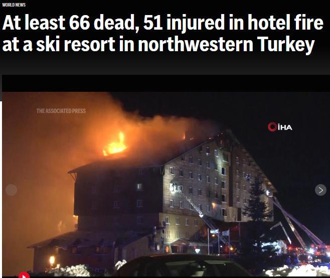 据报道,火灾发生在当天凌晨3点30分左右,地点是博卢省滑雪中心一家12层酒店的餐厅。