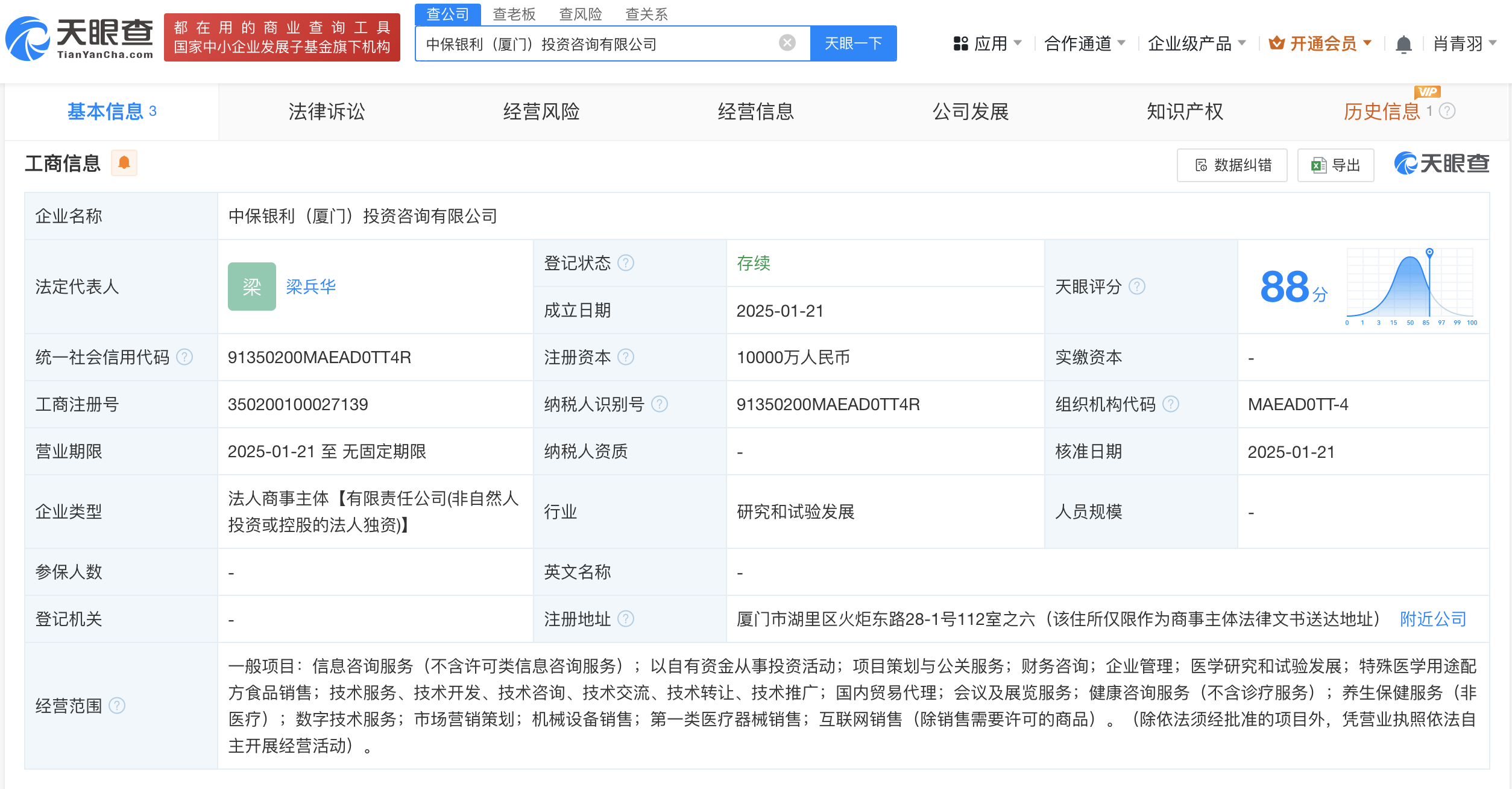 天眼查App显示,近日,中保银利(厦门)投资咨询有限公司成立,法定代表人为梁兵华,注册资本1亿人民币,经营范围含以自有资金从事投资活动、项目策划与公关服务、财务咨询、企业管理等。股东信息显示,该公司由保利国际控股有限公司全资持股。