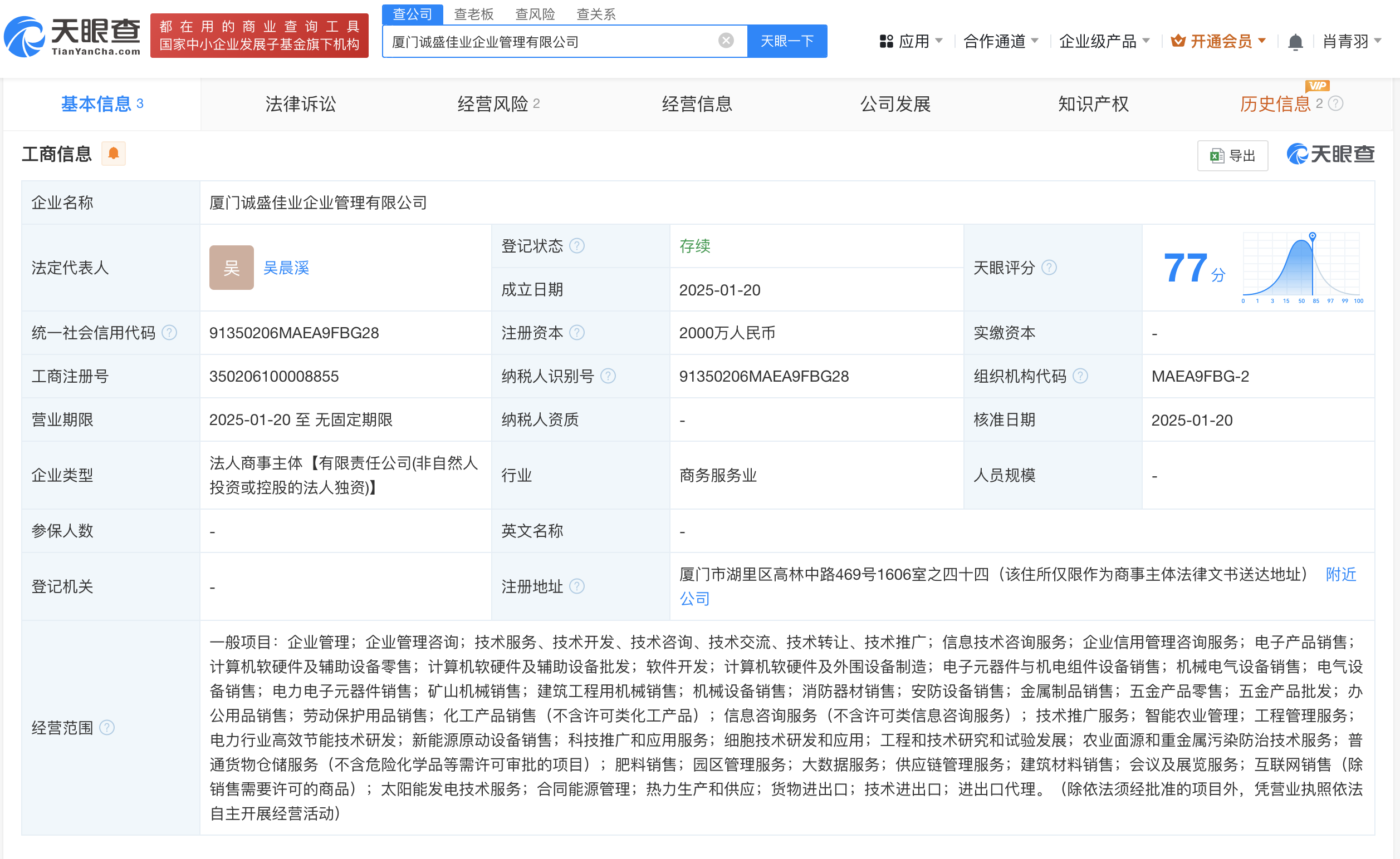 天眼查App显示,近日,厦门诚盛佳业企业管理有限公司成立,法定代表人为吴晨溪,注册资本2000万人民币,经营范围含信息技术咨询服务、企业信用管理咨询服务、电子产品销售、计算机软硬件及辅助设备零售、园区管理服务、大数据服务、供应链管理服务等。股东信息显示,该公司由华能新能源股份有限公司全资持股。