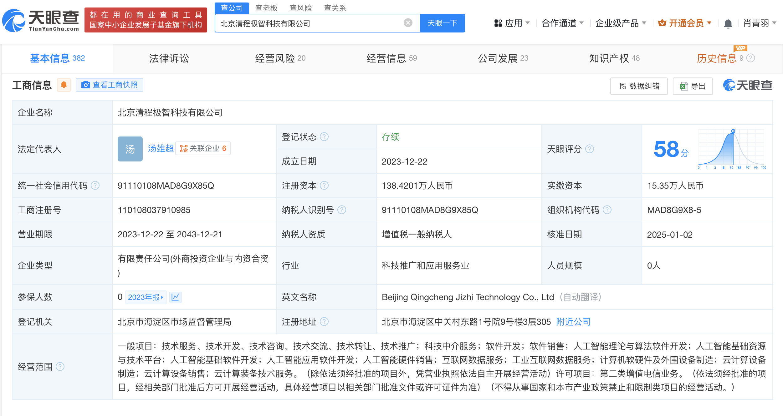 北京清程极智科技有限公司成立于2023年12月,法定代表人为汤雄超,经营范围含人工智能理论与算法软件开发、人工智能基础资源与技术平台、人工智能基础软件开发、人工智能应用软件开发、人工智能硬件销售、互联网数据服务等,现由北京清程万象科技中心(有限合伙)、北京清程纵横科技中心(有限合伙)等及上述新增股东共同持股。公开信息显示,清程极智是一家智能算力系统软件服务商。