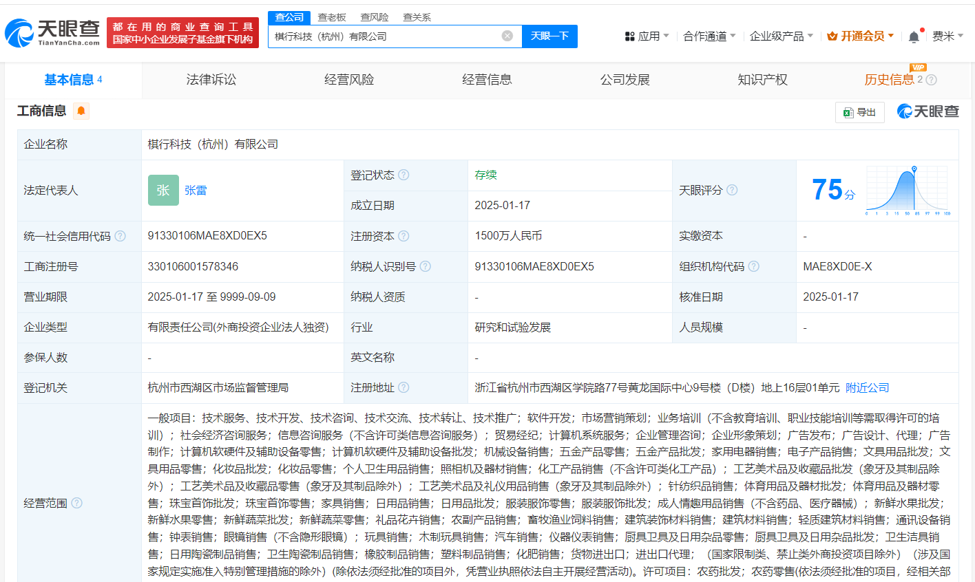 天眼查App显示,近日,棋行科技(杭州)有限公司成立,法定代表人为张雷,注册资本1500万人民币,经营范围含社会经济咨询服务、贸易经纪、计算机系统服务、企业管理咨询、企业形象策划、广告发布等。股权全景穿透图显示,该公司由薯阅信息科技(上海)有限公司全资持股,后者为小红书关联公司Redbook Holdings Limited全资子公司。