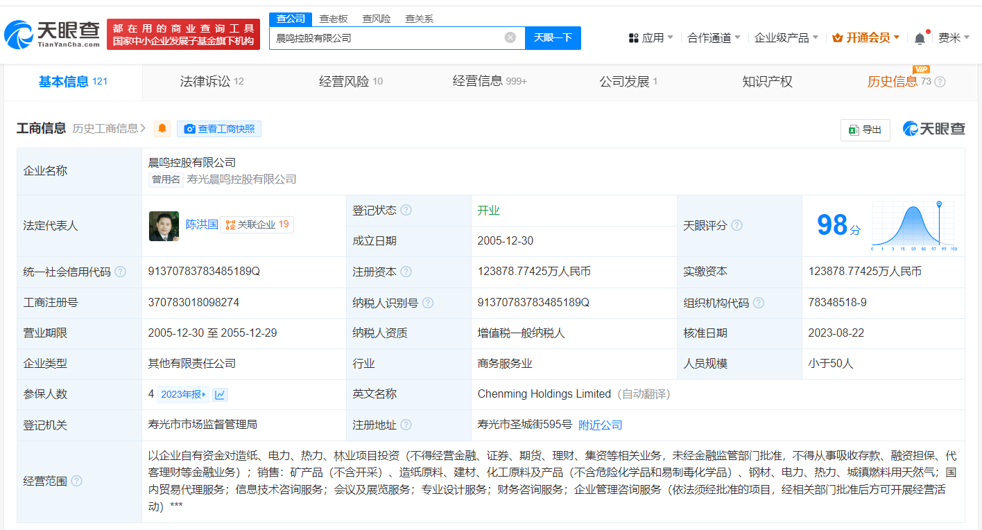 晨鸣控股有限公司成立于2005年12月,法定代表人为陈洪国,注册资本约12.4亿人民币,经营范围含以企业自有资金对造纸、电力、热力、林业项目投资,国内贸易代理服务,信息技术咨询服务等,由山东寿光金鑫投资发展控股集团有限公司、寿光市锐丰企业投资有限公司、寿光市恒联企业投资有限公司共同持股。对外投资信息显示,该公司持有晨鸣纸业(000488)约15.5%股份,为最大股东。