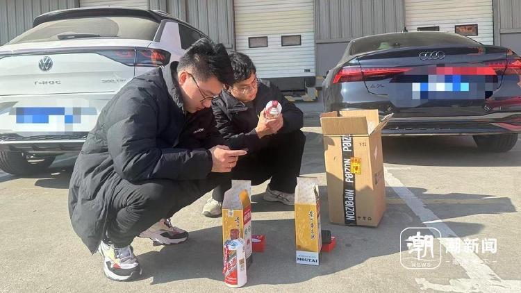 ▲徐先生和赖先生在查看检测后的茅台。潮新闻记者 吴越 摄