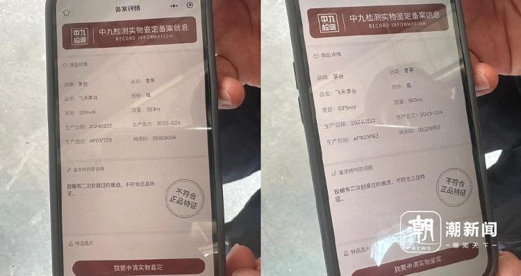 ▲第三方机构初步鉴定真的茅台,左侧为正品,右侧为“不符合正品特征”。潮新闻记者 吴越 摄