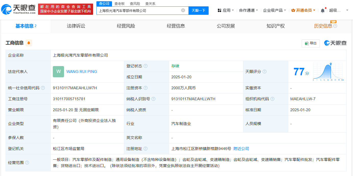 天眼查App显示,1月20日,上海极光湾汽车零部件有限公司成立,法定代表人为WANG RUI PING,注册资本2000万人民币,经营范围包括汽车零部件及配件制造、通用设备制造、汽车零配件批发、汽车零配件零售等。股东信息显示,该公司由极光湾科技有限公司全资持股。