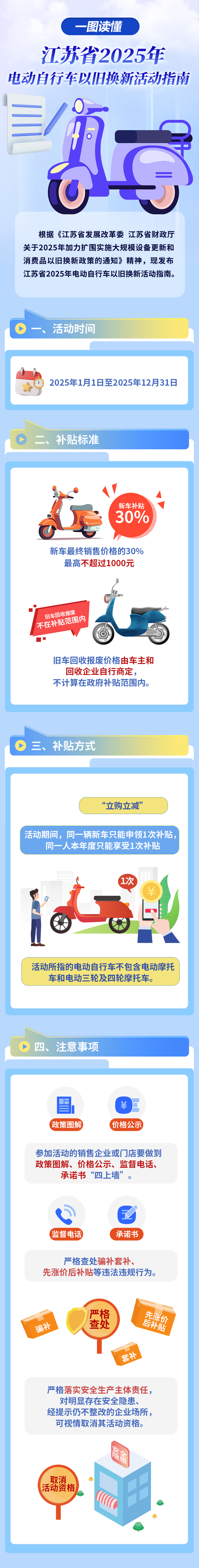江苏省商务厅发布《江苏省2025年电动自行车以旧换新活动指南》,活动时间为2025年1月1日至2025年12月31日。新车补贴标准为最终销售价格的30%,最高不超过1000元。