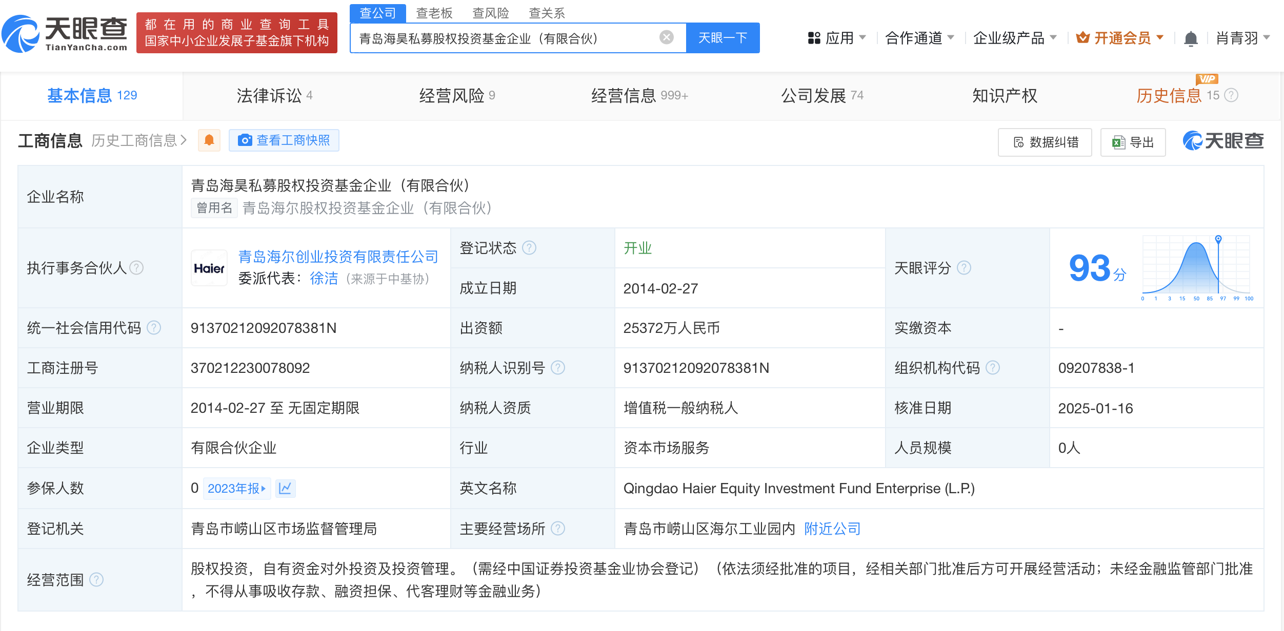 该基金成立于2014年2月,执行事务合伙人为青岛海尔创业投资有限责任公司,经营范围为股权投资、自有资金对外投资及投资管理。合伙人信息显示,该公司由海尔集团(青岛)金盈控股有限公司及旗下青岛海尔创业投资有限责任公司共同出资。