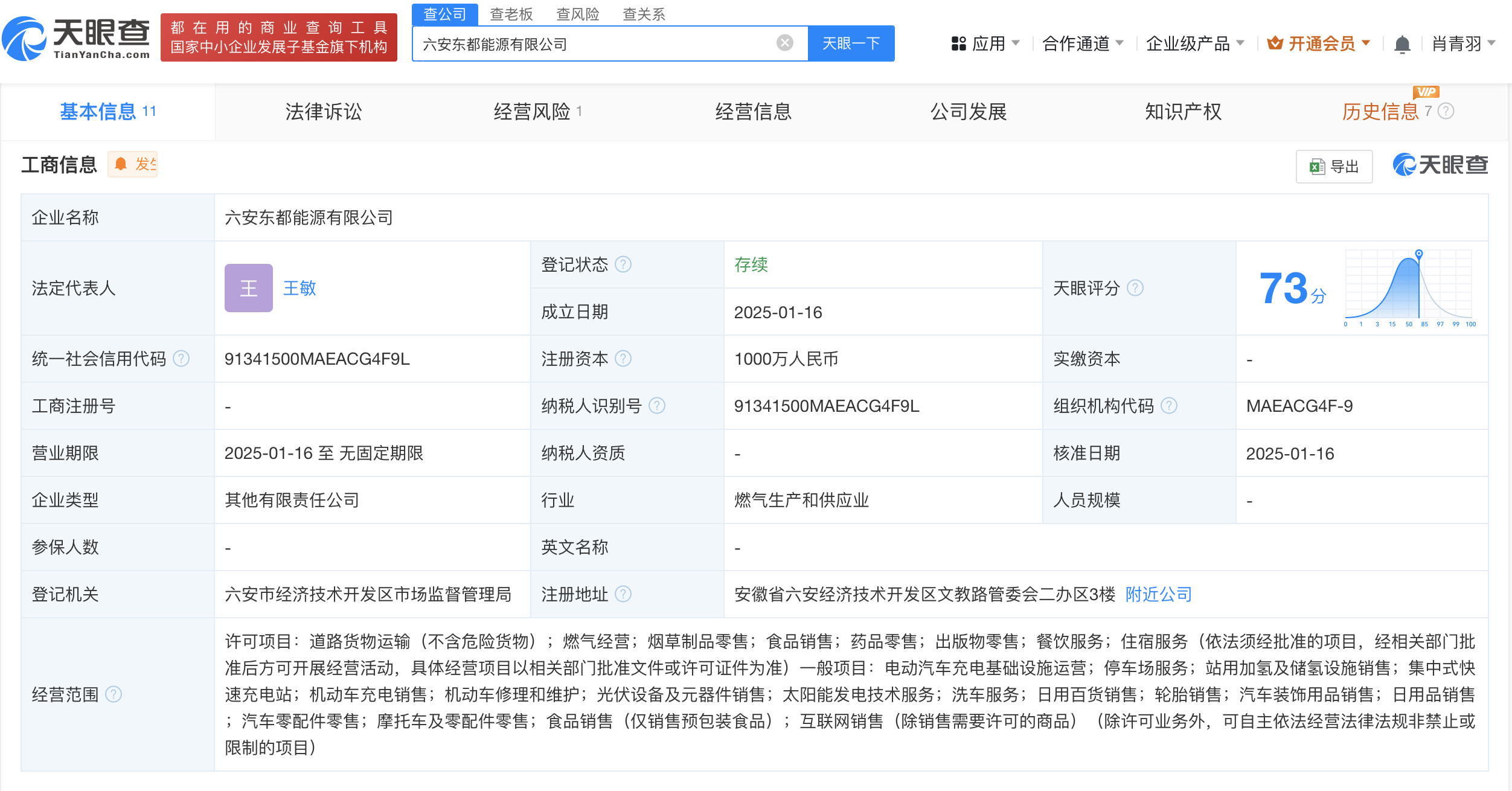 天眼查App显示,近日,六安东都能源有限公司成立,法定代表人为王敏,注册资本1000万人民币,经营范围含电动汽车充电基础设施运营、停车场服务、站用加氢及储氢设施销售、集中式快速充电站、机动车充电销售、机动车修理和维护、光伏设备及元器件销售、太阳能发电技术服务等,由六安新开能源发展有限公司、中国石化销售股份有限公司共同持股。