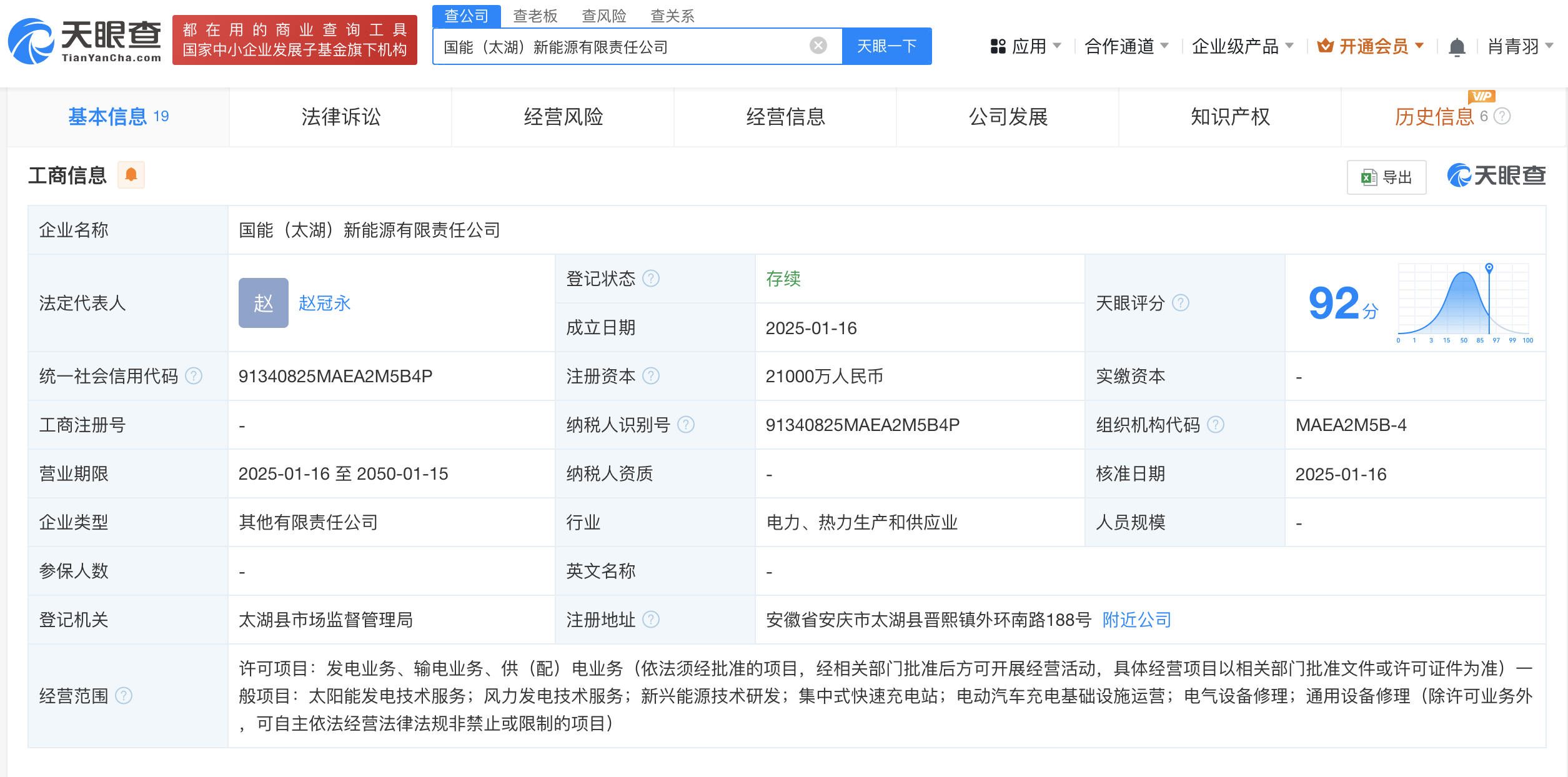 天眼查App显示,近日,国能(太湖)新能源有限责任公司成立,法定代表人为赵冠永,注册资本2.1亿人民币,经营范围含太阳能发电技术服务、风力发电技术服务、新兴能源技术研发、集中式快速充电站等,由太湖县龙山新能源有限责任公司、国家能源投资集团有限责任公司旗下国能安庆能源有限责任公司共同持股。