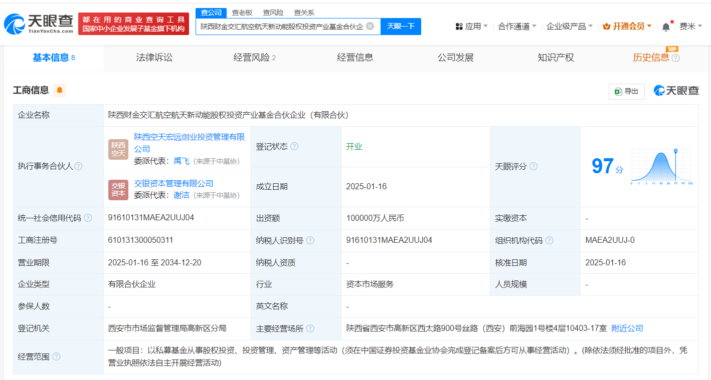 天眼查App显示,近日,陕西财金交汇航空航天新动能股权投资产业基金合伙企业(有限合伙)成立,执行事务合伙人为陕西空天宏远创业投资管理有限公司、交银资本管理有限公司,出资额10亿人民币,经营范围为以私募基金从事股权投资、投资管理、资产管理等活动,由交银金融资产投资有限公司、西安市工业倍增基金合伙企业(有限合伙)、陕西省政府投资引导基金合伙企业(有限合伙)等共同出资。