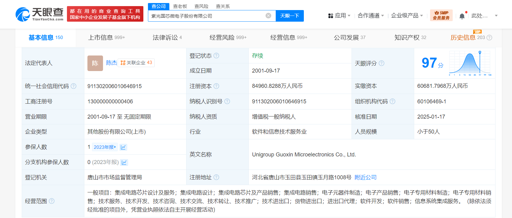 紫光国芯微电子股份有限公司成立于2001年9月,注册资本约8.5亿人民币,经营范围含集成电路芯片设计及服务、集成电路设计、集成电路芯片及产品销售、集成电路销售、电子元器件制造、电子专用材料制造等。股东信息显示,该公司由西藏紫光春华科技有限公司、香港中央结算有限公司等共同持股。