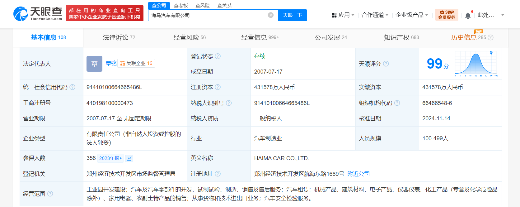 海马汽车有限公司成立于2007年7月,法定代表人为覃铭,注册资本约43.2亿人民币,经营范围含工业园开发建设,汽车及汽车零部件的开发、试制试验、制造、销售及售后服务,汽车租赁,机械产品、建筑材料、电子产品、仪器仪表、化工产品、家用电器、农副土特产品的销售,从事货物和技术进出口业务,汽车安全检验服务。股东信息显示,该公司由海马汽车(000572)全资持股。