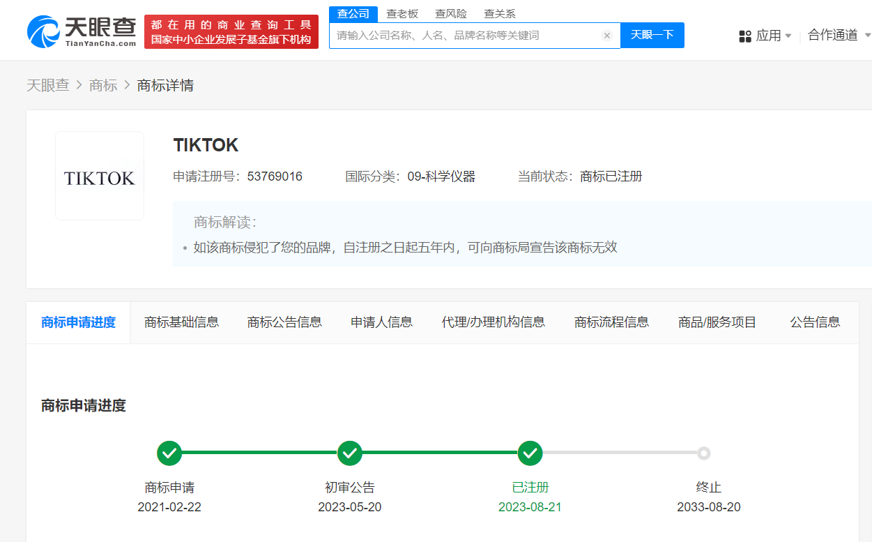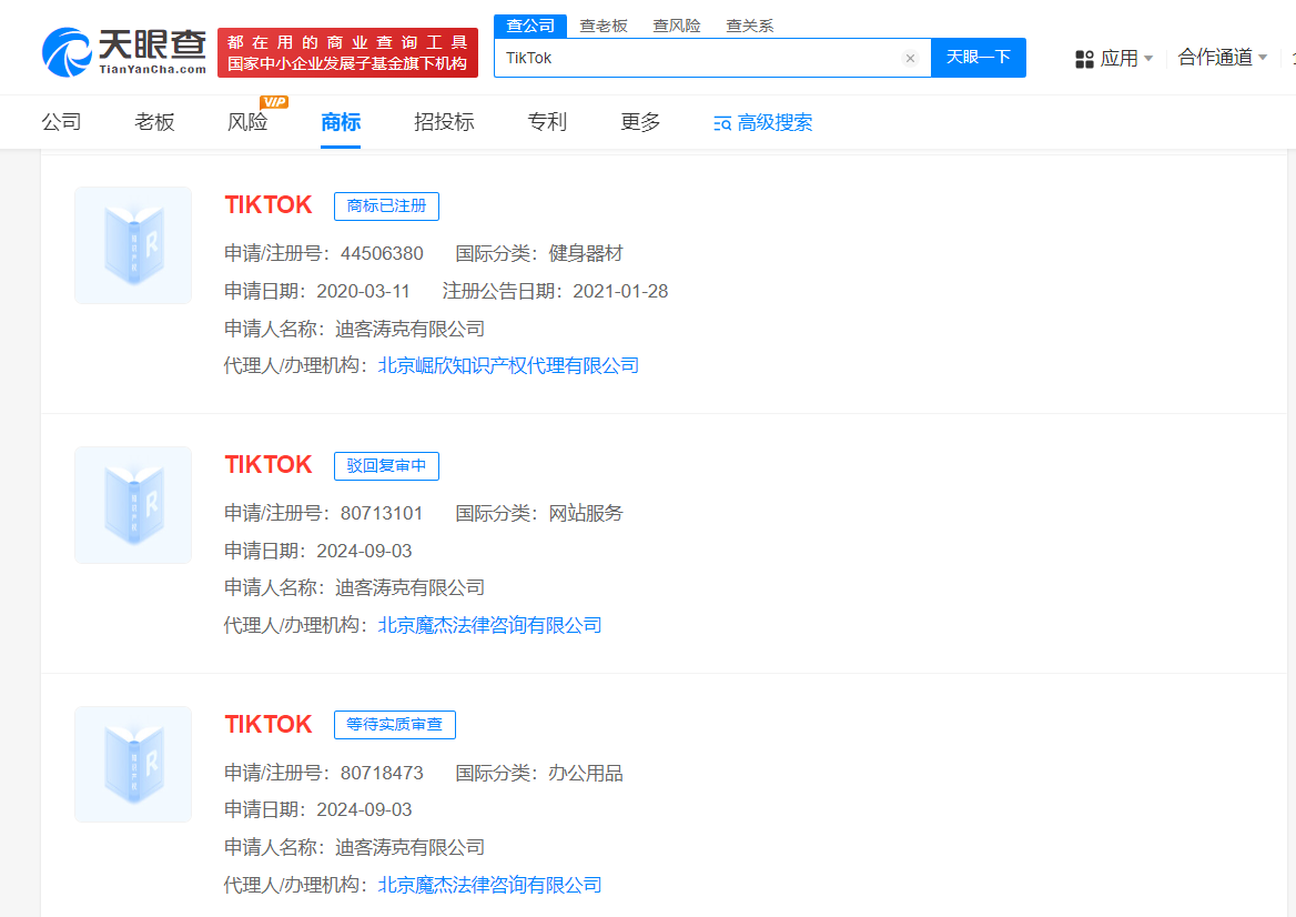 天眼查知识产权信息显示,“TIKTOK”已被多方申请注册为商标,申请人包括迪客涛克有限公司(TIKTOK LTD.)、北京抖音信息服务有限公司及多个自然人等,国际分类涉及金融物管、科学仪器、广告销售等,当前部分商标已注册成功。