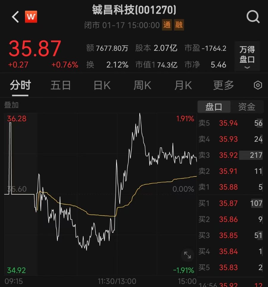 截至1月17日收盘,铖昌科技最新股价报每股35.87元,总市值74.35亿元。