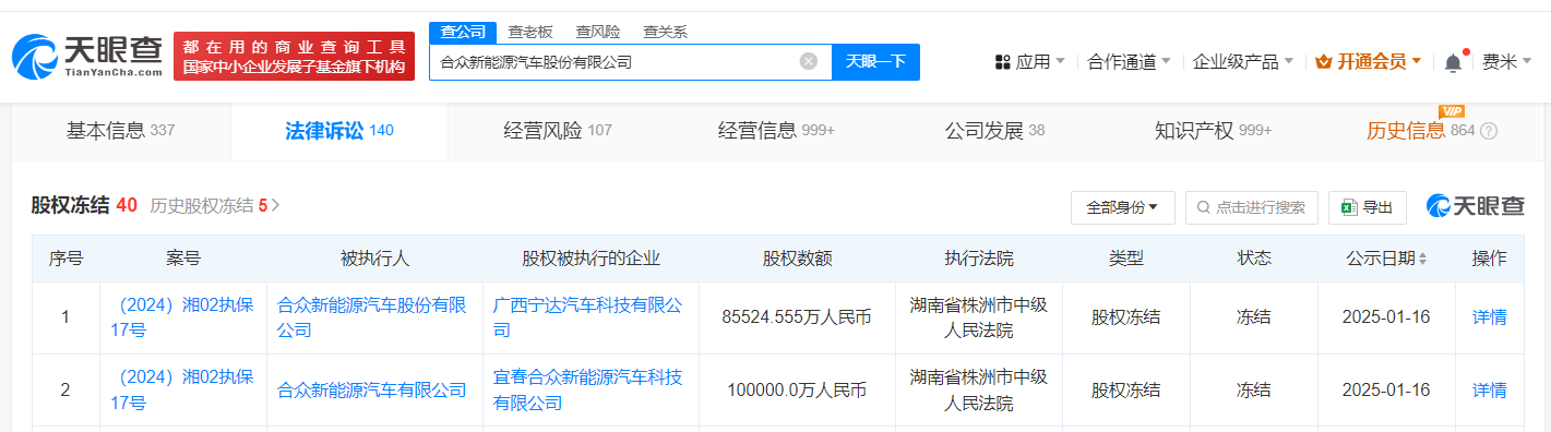天眼查天眼风险信息显示,近日,哪吒汽车关联公司合众新能源汽车股份有限公司新增两条股权冻结信息,股权被执行的企业为宜春合众新能源汽车科技有限公司、广西宁达汽车科技有限公司,冻结股权数额合计18.5亿余元人民币,冻结期限均为三年,执行法院为湖南省株洲市中级人民法院。
