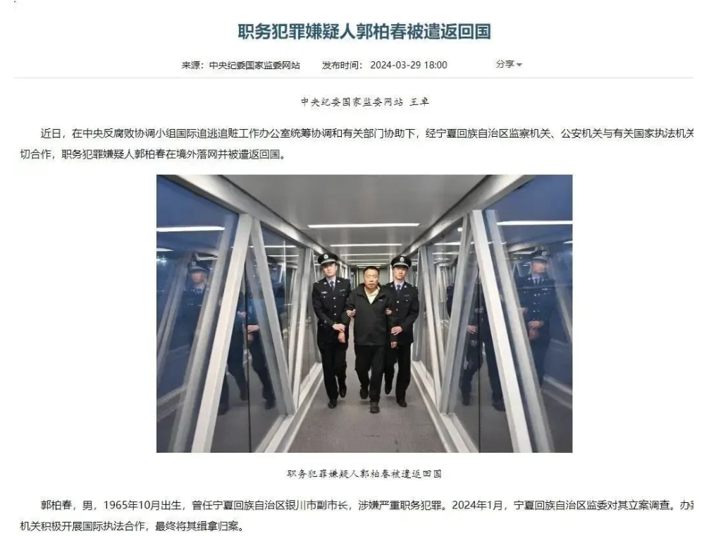 此前,2024年3月29日,中央纪委国家监委网站消息,近日,在中央反腐败协调小组国际追逃追赃工作办公室统筹协调和有关部门协助下,经宁夏回族自治区监察机关、公安机关与有关国家执法机关密切合作,职务犯罪嫌疑人郭柏春在境外落网并被遣返回国。